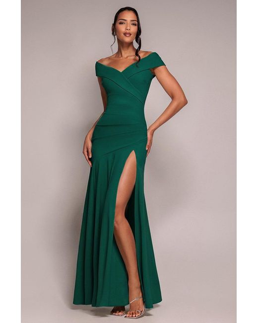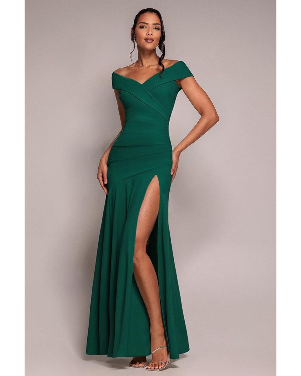 Women's Green Scuba Crepe Off Shoulder Front Split Maxi Dress