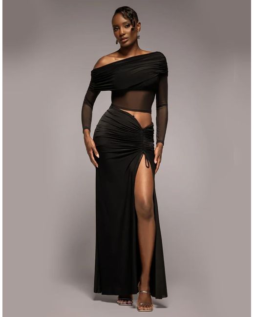 Asymmetric Gathered Front Split Maxi Skirt - Black
