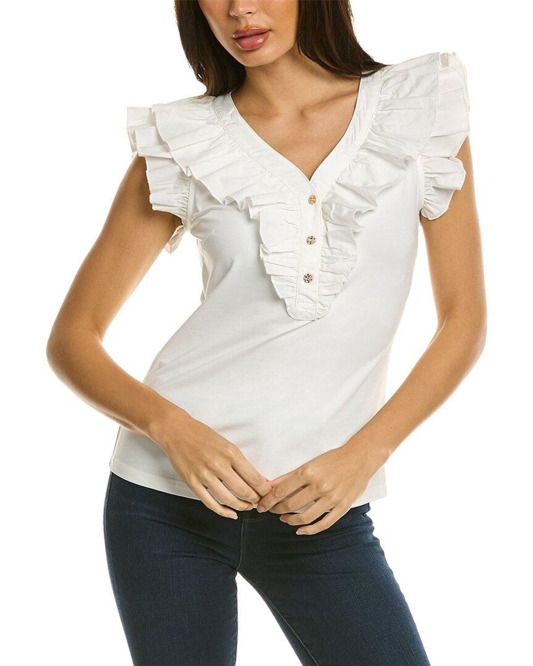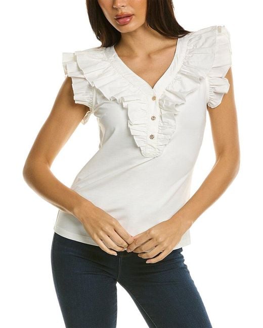 About the brand: Uniquely inventive and modern designs. Ruffle Solid Top in white Approximately 25in from shoulder to hem Button placket 64% rayon, 27% nylon, 9% spandex Hand wash Imported