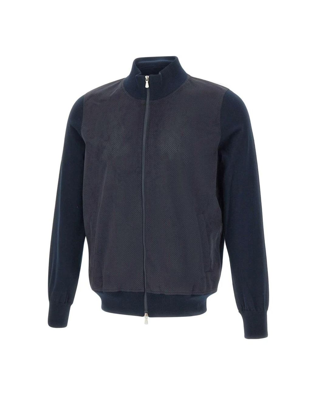 Gran Sasso Micro-Perforated Alcantara Zip Jacket pairs a refined textured front panel with a cotton-knit body for versatile smart-casual wear. Its double-slider zip and ribbed finishes create a structured, modern silhouette ideal for everyday layering. Key attributes: Dark blue | Cotton | Double-slider zip closure | Two side welt pockets | Micro-perforated Alcantara front panel | Ribbed collar, hem and cuffs | Structured silhouette | Dimensions & fit: Regular fit | Composition & care: Cotton knit | Alcantara Colour: blue