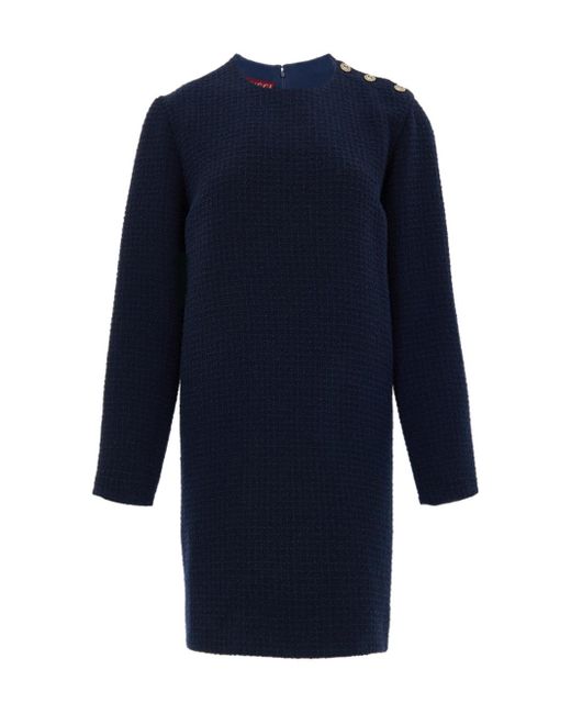 Blue Bouclé Dress with Gucci Logo Buttons.. Mid-length dress, round neckline, long sleeves, two side welt pockets, shoulder opening with gold Gucci logo buttons. Straight-fit, internal lining.. Composition: 84% Wool 16% Polyamide. Internal SKU: 25GIU195. SKU Brand: 797358ZAN3M4002