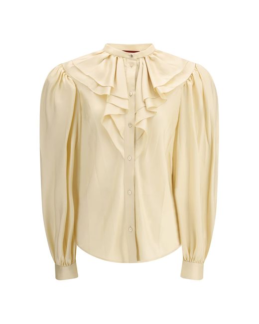 The silk twill shirt by gucci embodies refined elegance with a confident romantic flair. designed in a regular fit, it fits true to size and offers effortless wearability, while the silk twill fabric provides a smooth, fluid feel with a subtle sheen. the silhouette is enhanced by delicate ruffle trim, contrasted with wide shoulders that add structure and modern attitude. long sleeves and a single-row front button closure, finished with the iconic interlock g button detail, complete a sophisticated piece that transitions seamlessly from polished daywear to elevated evening looks. Composition: 100% % Silk