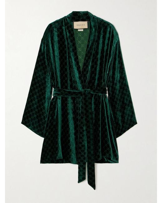 Gucci's 'GG' monogram is not only a clear giveaway a design is the brand's, but it also represents a heritage of quality and grandeur. This robe is made from devoré-velvet featuring the motif and has a wrap design that secures with waist-cinching ties. Wear it as a set with the coordinating trousers in our edit. Colour: green