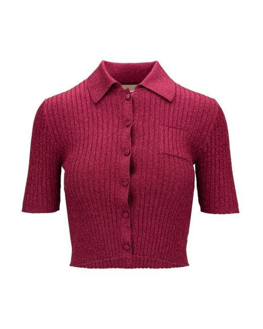 Gucci Cropped Polo Shirt updates a classic polo silhouette with a metallic-knit finish and logo detailing. The cropped length and embossed logo buttons create a refined, statement-ready top. Key attributes: Red | Fucsia metallizzato | Viscose | Mini chest pocket | Button fastening | Logo patch under collar | Classic polo collar | Short sleeves | Cropped silhouette | Embossed logo buttons | Logo patch sewn under the back collar | Mini chest pocket | Dimensions & fit: Shoulder size (cm): 30 (Xs), 31 (S) | Chest size (cm): 30 (Xs), 32 (S) | Length (cm): 40 (Xs), 40 (S) | Sleeve size (cm): 38 (Xs), 39 (S) | Composition & care: Main fabric: 55% viscose, 28% metallic fibre, 16% polyamide, 1% elastane | Trims: 57% viscose, 26% metallic fibre, 16% polyamide, 1% elastane Colour: red