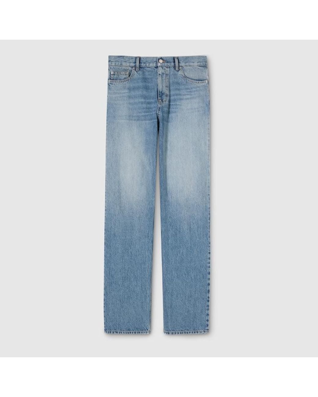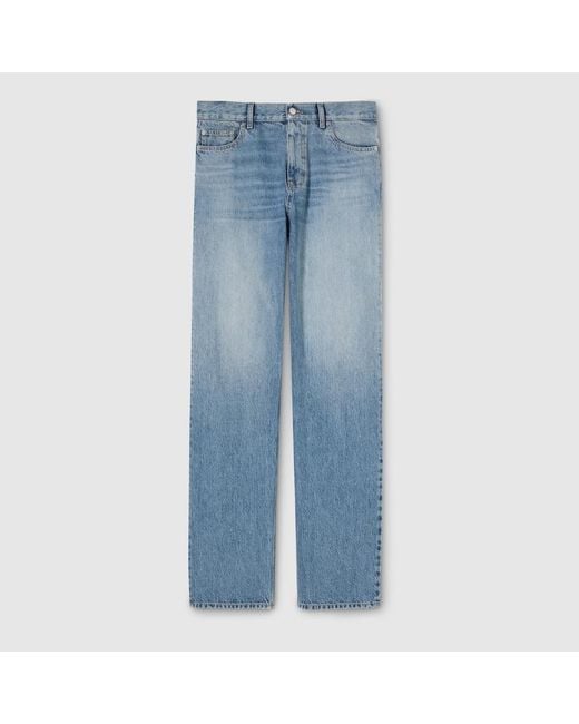 Refined washes, precise construction, and design coherence elevate denim pieces, bridging the House's legacy and what's next. This pair of cotton denim trousers is defined by a naplak label on the back, adding a distinctive touch. Blue washed certified cotton denim , Gucci Rosso Ancora naplak label, Five-pocket style, Belt loops, Button and zip fly closure, Total length: 118cm, Hem width: 19cm, based on a size 32 Colour: blue