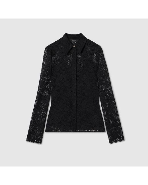 Introducing Spring Summer 2026. This style is inspired by the "La Sciura" look of La Famiglia. The collection reinterprets the House's codes through singular personalities and distinctive aesthetic attitudes. Crafted from GG flower stretch lace, this shirt is enriched with GG metal buttons. , Black GG flower stretch lace , GG metal buttons, Detachable camisole, Long sleeves, Front button closure, Length: 58.5cm, based on a size 38(IT), Made in Italy Colour: black