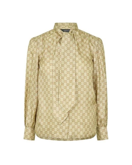 The Gucci Women's Long Sleeve Blouse is designed with a GG pattern across lightweight silk. Its tailored fit maintains a structured profile through wear. Product Highlights • Full-length sleeves provide extended coverage • Silk weave allows smooth movement and drape • Collar detail frames the neckline cleanly Colour: natural