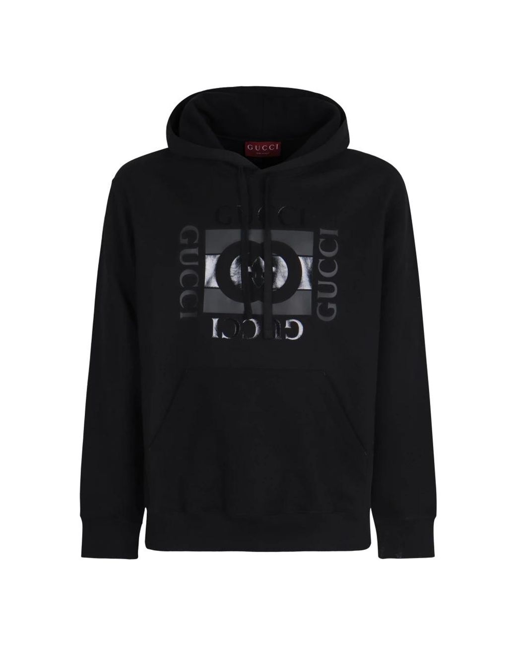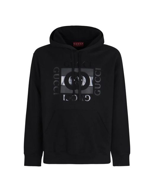 Gucci Cotton Jersey Sweatshirt updated with the GG Intersection print — a casual, everyday hoodie that pairs comfort with recognizable branding. Practical details include a fixed drawstring hood and a kangaroo pocket for hands-free storage. Key attributes: Black | Cotton | Stretch fabric | Fixed hood with drawstring | Kangaroo pocket | Long sleeves | Ribbed cuffs and hem | GG Intersection print | Composition & care: 98% Cotton | 2% Elastane Colour: black