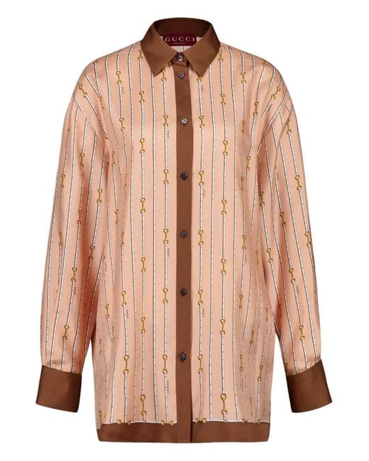 Light pink horsebit pattern vertical stripes long sleeves button fastening brown collar Size: 40. Gender: Female. Material:Silk. Colour: pink