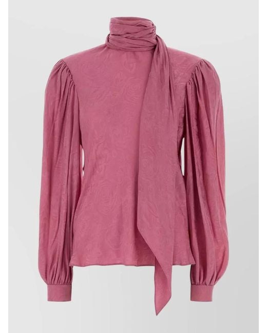 Women's Pink Twill Blouse Puff Sleeves Scarf Detail