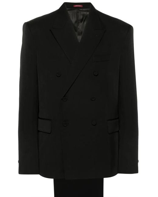 Black wool interlock twill weave Jacket: double-breasted button fastening peak lapels shoulder pads long sleeves faux-buttoned cuffs chest welt pocket dart detailing two front flap pockets American rear vent two internal jetted pockets full lining straight hem Trousers: concealed front button, hook and zip fastening mid-rise belt loops pressed crease two diagonal pockets to the sides dart detailing two rear welt pockets short side slits straight leg tailored cut Size: 46. Gender: Male. Material:Viscose/Polyester/Wool/Cotton. Colour: black