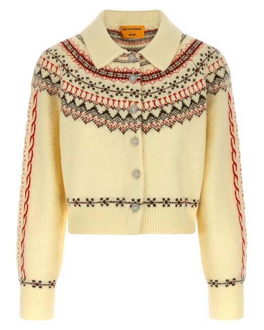 'Cloud Chalet' cashmere blend cardigan with 'Fair Isle' collar, front button closure, slightly reduced fit, long cuffed sleeves SizeAndFit: True to size fitGender: WomenMaterial: 70% WOOL 30% CASHMEREColor: MULTICOLORMade in: ImportedProduct ID: W38927AMMISTCOMBO*Import tax/duty will be calculated at checkout (If applicable) Colour: metallic