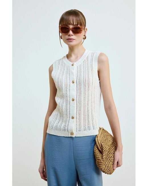 Our sizes run large, Cotton fabric offers soft and comfortable use. Buttoned details add a classic atmosphere to the vest, while the knitwear texture creates an elegant silhouette. While the ecru colour adds a natural and fresh atmosphere, it easily harmonizes with different clothing items. It offers an outerwear option that is both stylish and comfortable. Colour: white