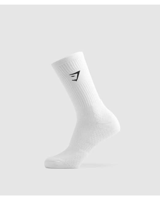 The Gymshark Premium Embroidered Crew Socks provide comfort, cushioning and contouring with a mix of reinforced stretch and ribbing and a flattering fit to the calf. You can be sure you’ll step with support and step with style, from treadmill to sidewalk. - One pair per pack- High crew sock fit- Terry Knit to heel and toe for cushioning- Embroidered Gymshark logo to shin- 69% Cotton, 28% Nylon, 3% Elastane- Small: UK 2-5. Medium: UK 6-8. Large: UK 9-11- SKU: I2A5M-WBBM Colour: white