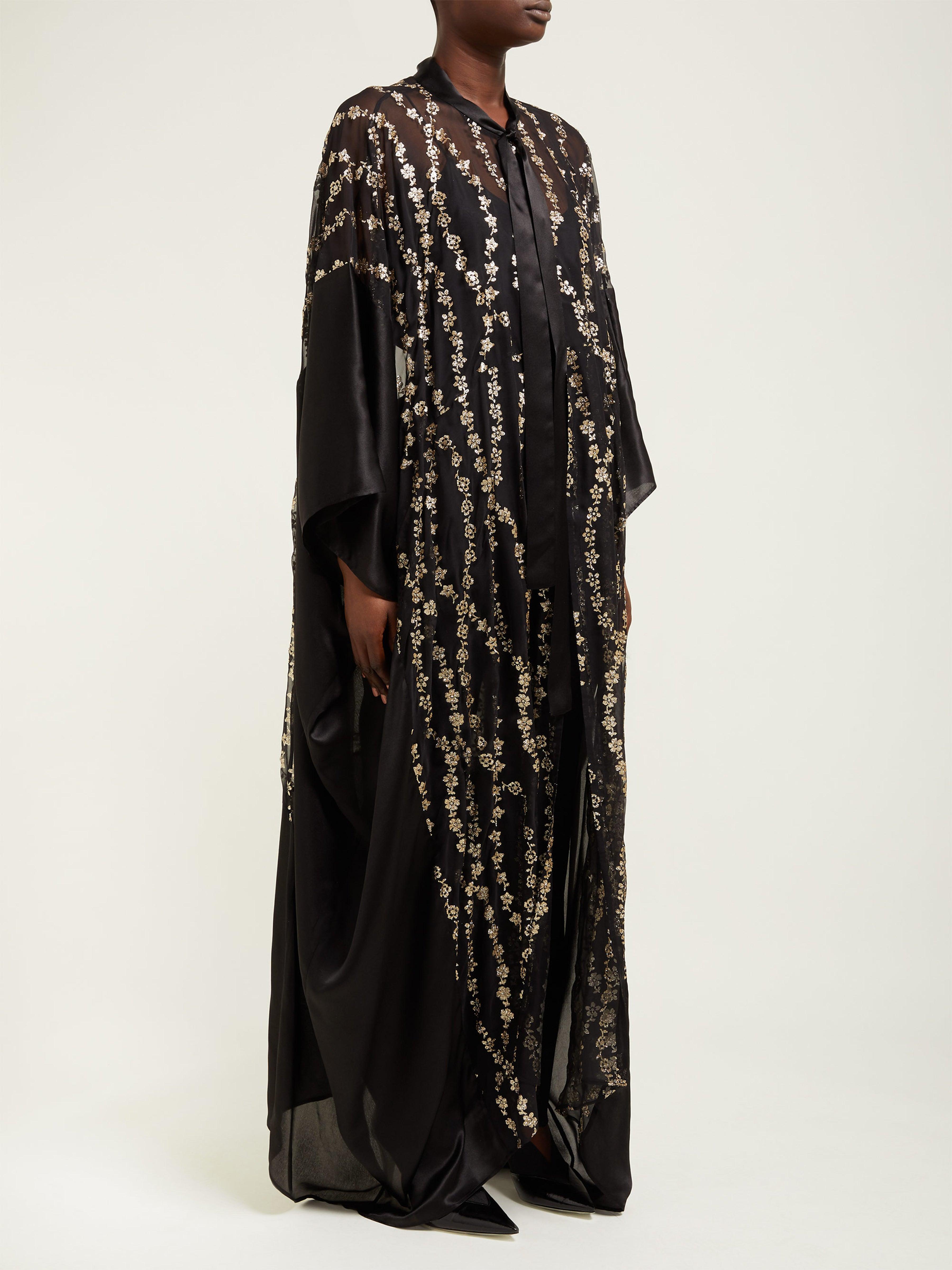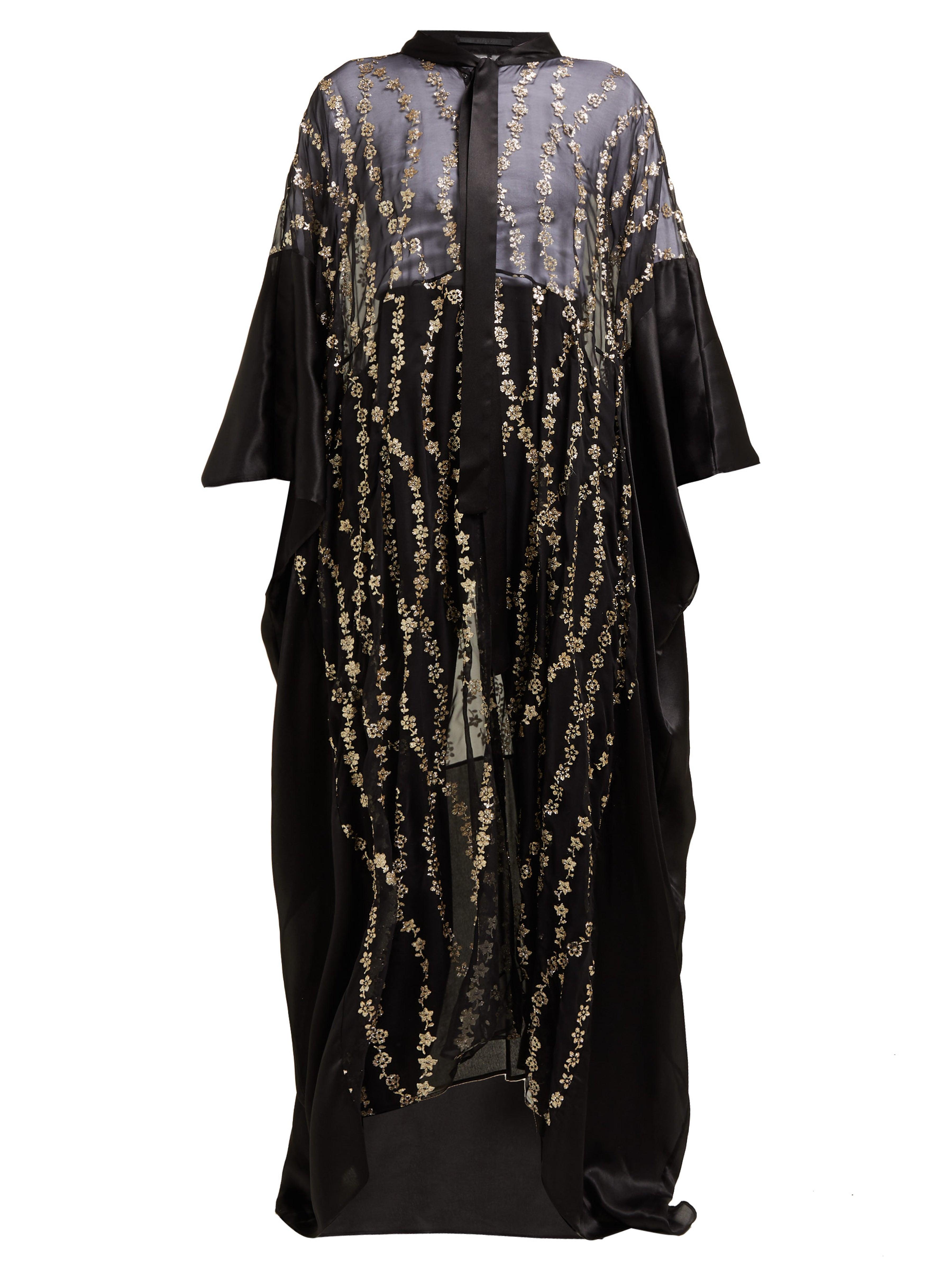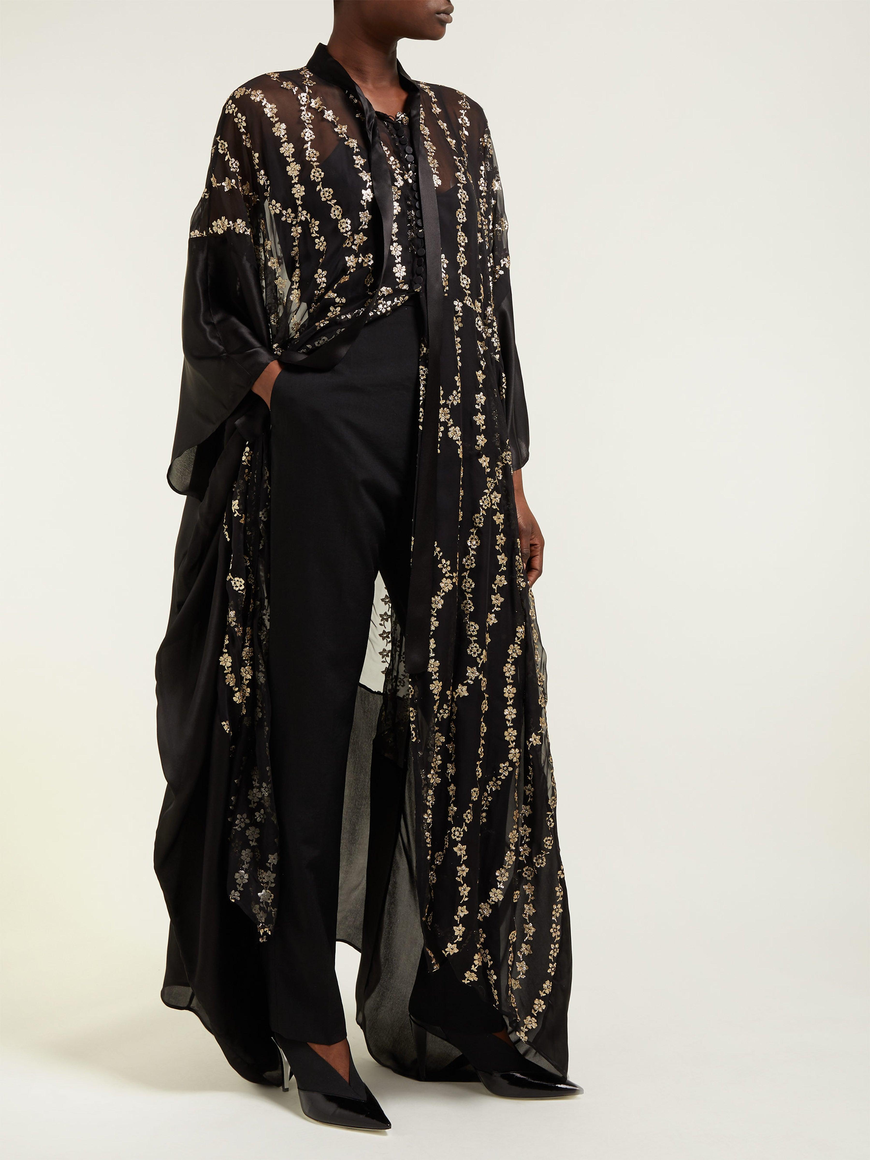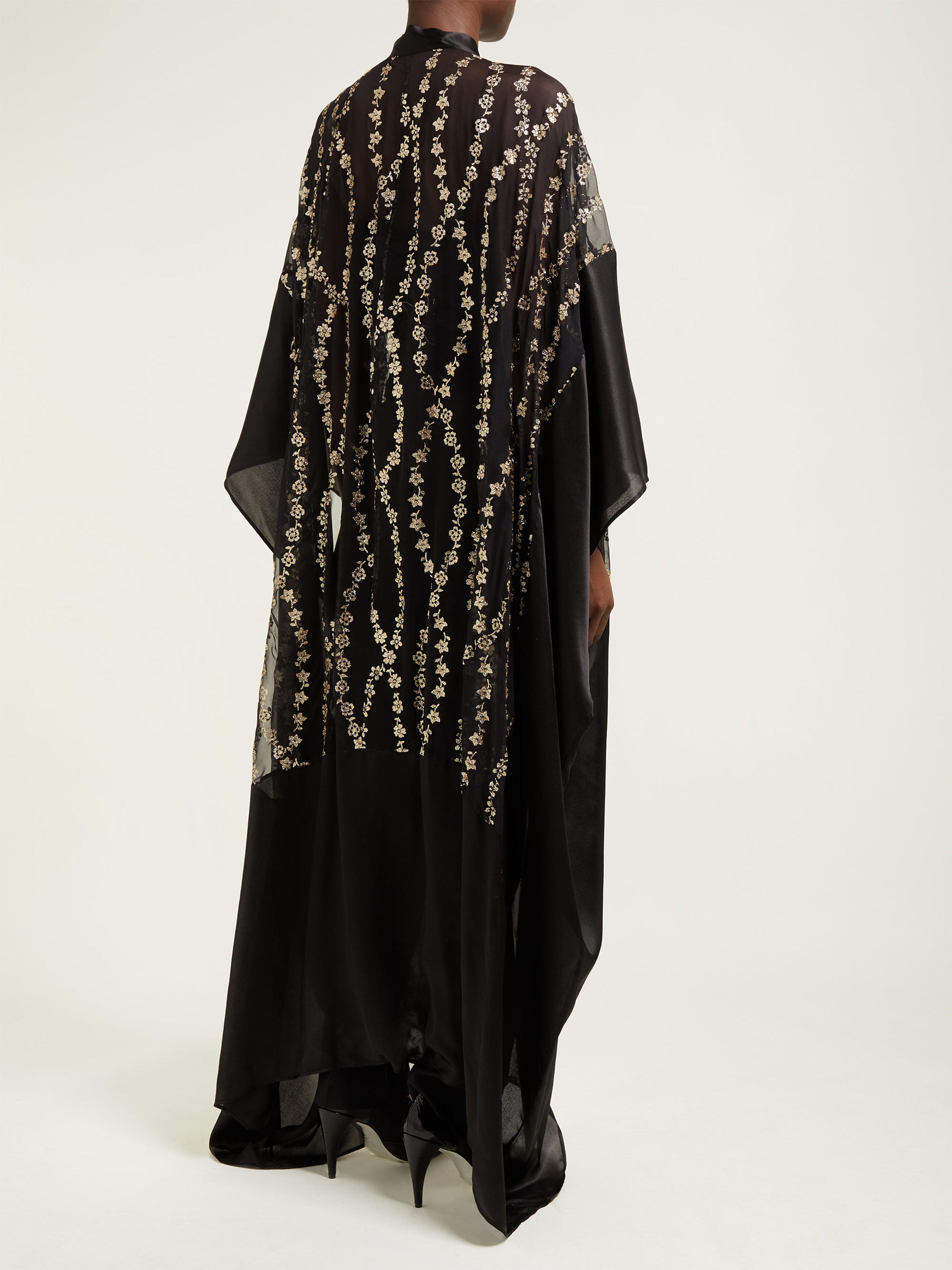 Go to MATCHESFASHIONThis black chiffon coat is reminiscent of styles spotted on Haider Ackermann's SS19 runway. Adorned with glittery florals, the elegant, ethereal silhouette has a neck tie, sleek silk-satin panels, kimono-style sleeves and a row of matching covered buttons down the front. Wear it over a top-to-toe black edit to highlight the shimmering accents. 52%POLYESTER/48%SILK. Colour: black