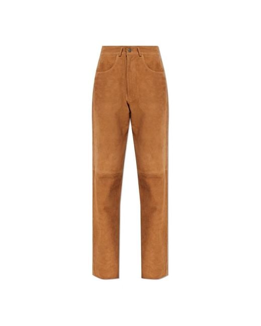 Haikure Korea Suede Trousers combine a high-rise, refined silhouette with soft kid-suede for an elevated everyday pant. The design focuses on clean lines and practical detailing for versatile wear. Key attributes: Brown | Kid suede | Western-style front pockets | Back patch pockets | Wide belt loops | Metal button and zip fastening | High waist | Straight leg | Patch pockets at the back | Wide belt loops | Dimensions & fit: Model height: 177 cm | Bust: 83 cm | Waist: 61 cm | Hips: 89 cm | Model is wearing size: 27 | High-waisted fit | Straight-leg silhouette | Designed for freedom of movement | Composition & care: 100% suede (goat) | Specialist clean only. Colour: brown