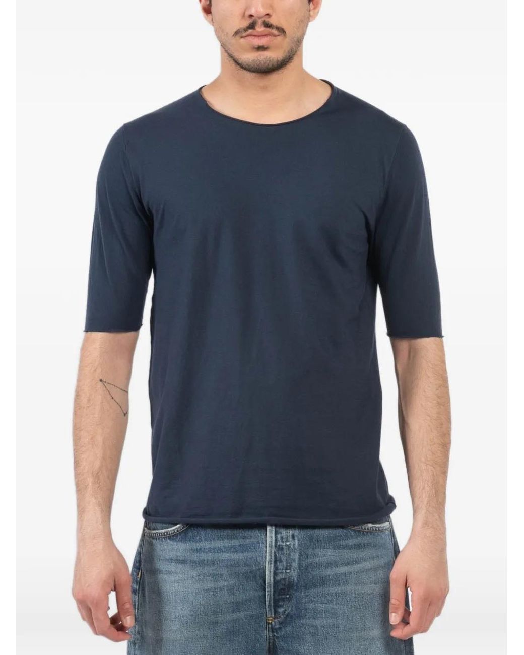 Dark blue raw-cut trim short sleeves crew neck logo patch at the back Size: M. Gender: Male. Material:Cotton. Colour: blue