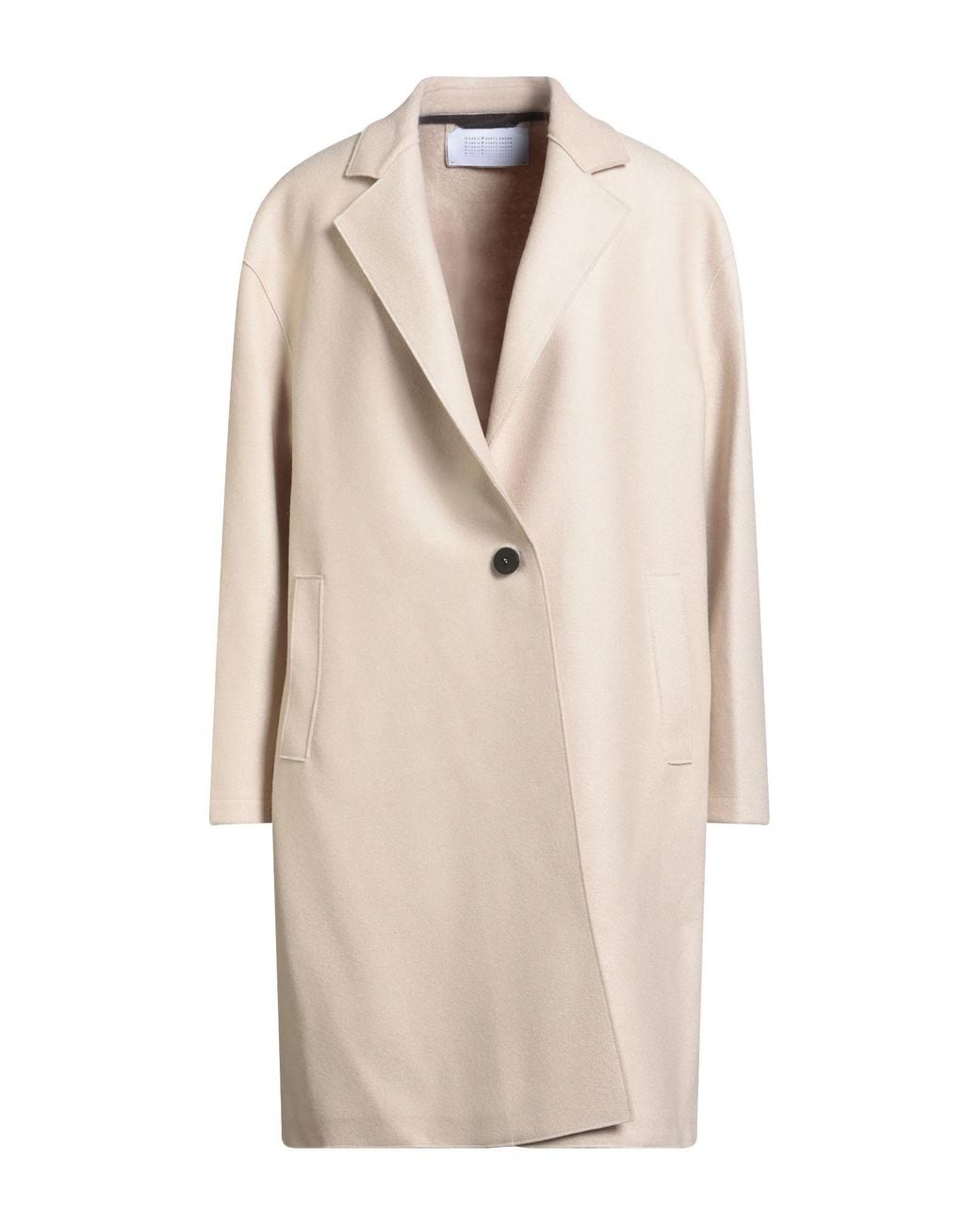 HARRIS WHARF LONDON. single-breasted coat, boiled wool, no appliqués, plain colour, lapel collar, long sleeves, partially lined, button fastenings, slit pockets, dry clean, do not bleach, do not tumble dry. 100% Virgin Wool.