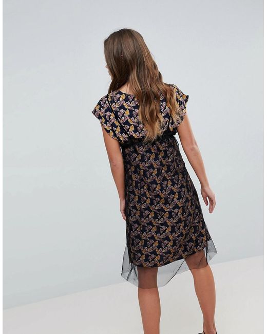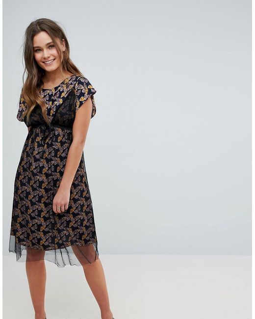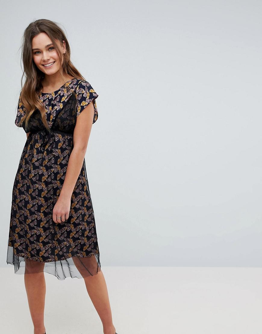 Women's Black Floral Print Midi Dress With Mesh Overlay