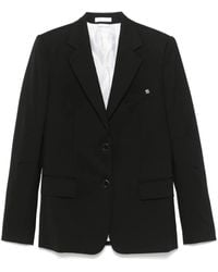 Go to SSENSEVirgin wool delaine blazer. · Notched lapel · Logo plaque at chest · Button closure · Welt pocket and flap pockets · Padded shoulders · Darts at sleeves · Three-button surgeon's cuffs ·