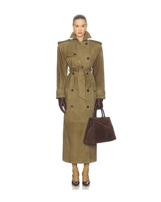 Helsa Suede Trench Coat in Green. Size L. Also in M, S, XL, XS, XXS. Helsa Suede Trench Coat in Green. Size M, S, XL, XS, XXS. Self: 100% Leather Lining: 100% polyester. Made in India. Professional leather cleaner only. Button down closure. Side seam pockets. Wrap tie belt. Shoulder pads. Real suede. HLSA-WO102. HEOW10035 H25. Inspired by her Scandinavian heritage, founder Elsa Hosk, honors the philosophy of timeless wardrobe staples, comfort, functionality, and minimalism. Influenced by the colors and materials found in nature, Helsa focuses on an Earth-First approach creating well-made pieces that offer a true sense of confidence and leisure that will last you season after season.