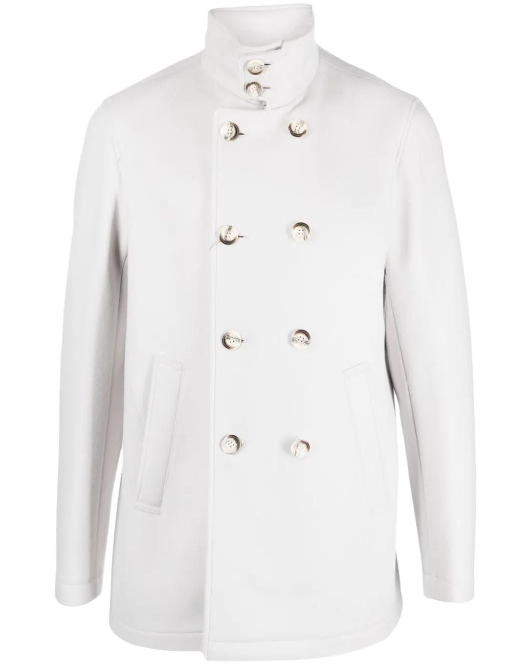 Light grey wool-cashmere blend high neck long sleeves double-breasted button fastening two side welt pockets Size: 54. Gender: Male. Material:Wool/Polyester/Cashmere.