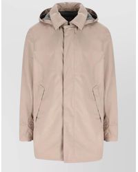 Go to FARFETCHAlmond beige concealed front button fastening waterproof two press-stud fastening side pockets central rear vent Size: 48. Gender: Male. Material:Polyester/Cotton/Cotton. Colour: white