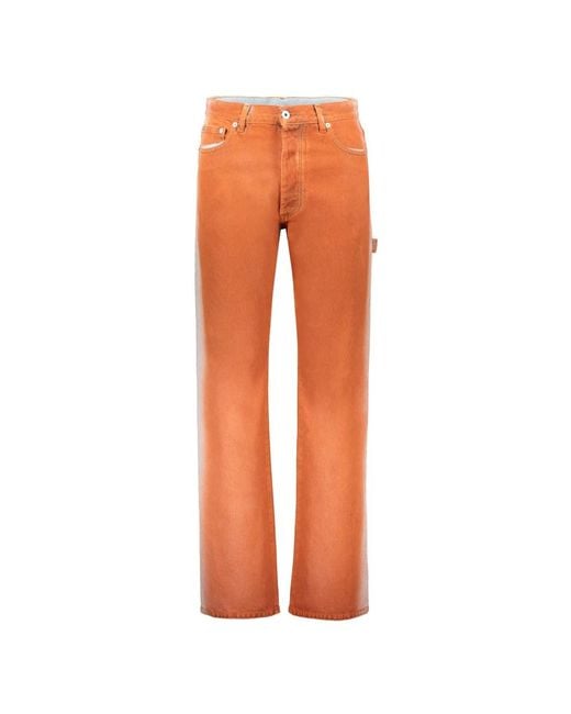 Heron Preston`s Gradient Effect Jeans offer a unique style with their eye-catching gradient design and signature back logo label. Perfect for adding a bold touch to any outfit. Key attributes: Orange | 65% Polyester | 100% Cotton | 35% Cotton | Gradient effect | Back logo label | Metal buttons and rivets engraved with brand`s logo | Dimensions & fit: Regular fit | Composition & care: 65% Polyester | 100% Cotton | 35% Cotton | Machine wash cold, tumble dry low Colour: orange
