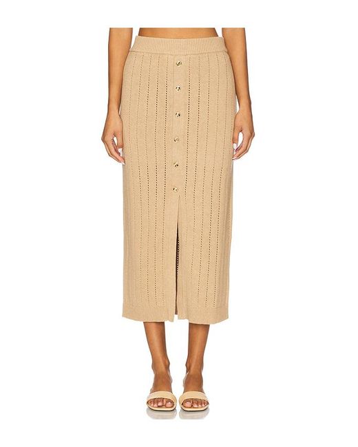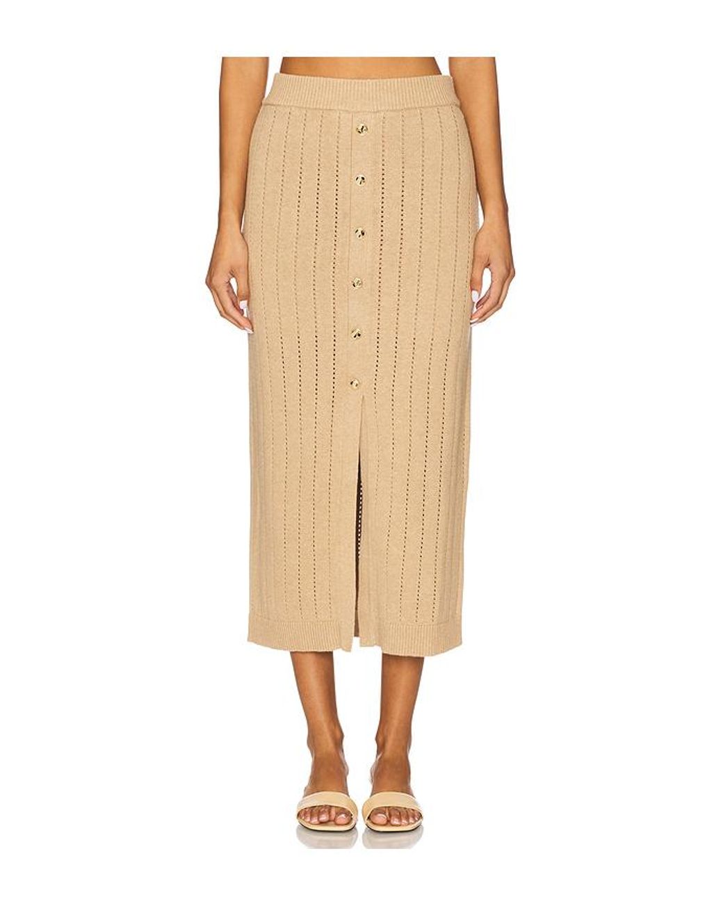 HEVRON Mia Skirt in Tan. Size M. Also in XL. HEVRON Mia Skirt in Tan. Size XL. Knit textile. Hand wash recommended. Unlined. Pull-on styling with elastic waistband. Front button detail. Front slit. Item not sold as a set. Skirt measures approx 35.5 in length. HEVR-WQ1. HF25SK050.