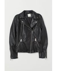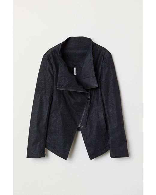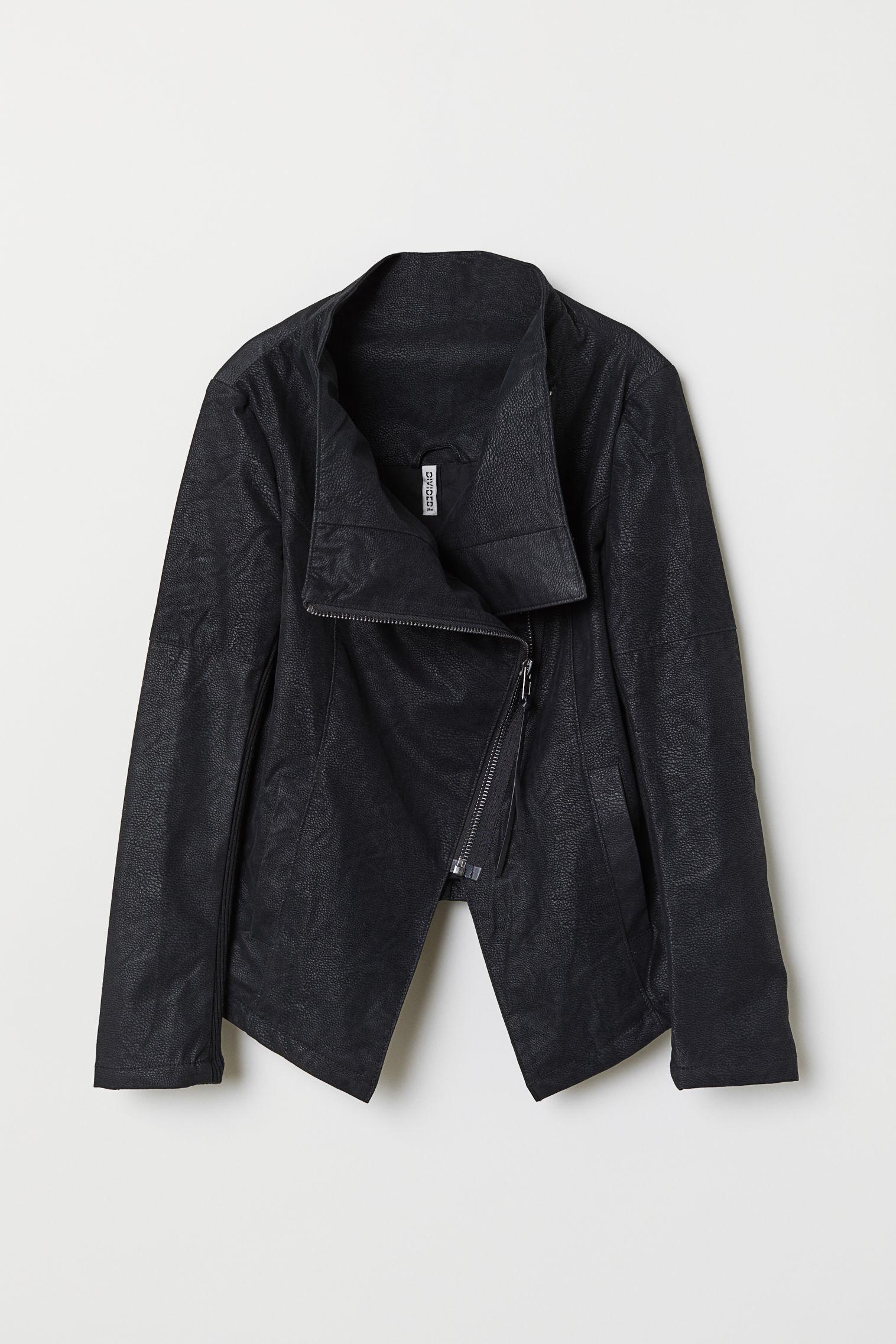 Biker jacket in imitation leather with a diagonal zip at the front, side pockets and ribbed jersey sections under the arms. Lined. Colour: black
