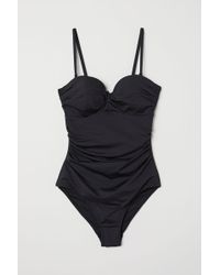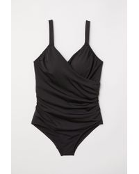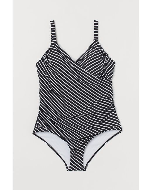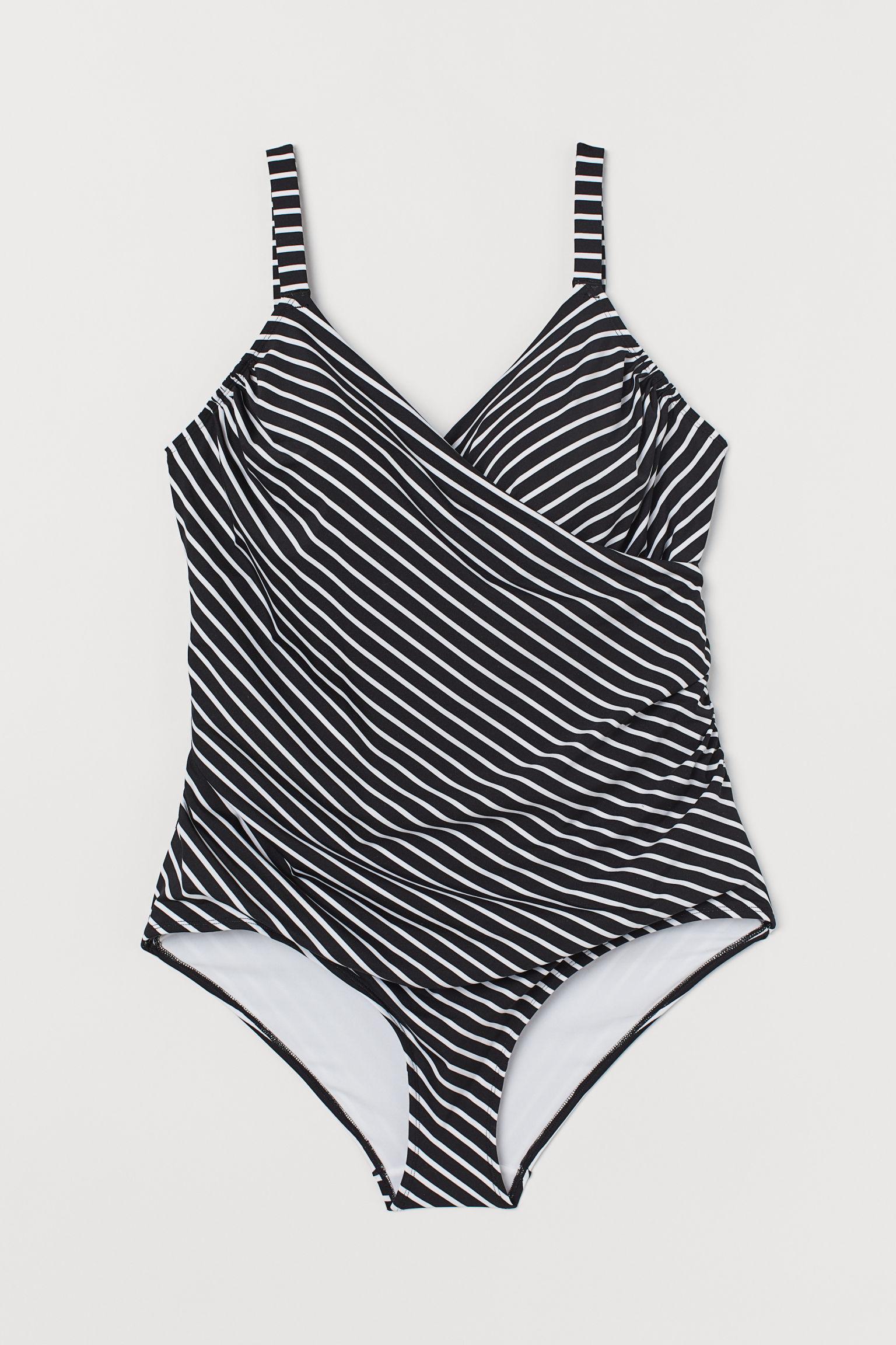 Fully lined shaping swimsuit with sculpting effect on tummy, back, and seat. Wrapover top and lightly padded cups. Boning in sides, decorative gathers at sides, and wide, adjustable shoulder straps. Polyamide 87%, Elastane 13%. Lining: Polyester 88%, Elastane 12%. Cup lining: Polyester 100%. Hand wash. Colour: black