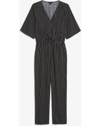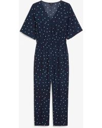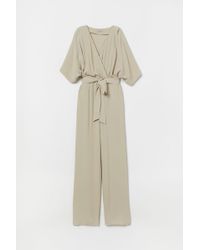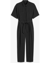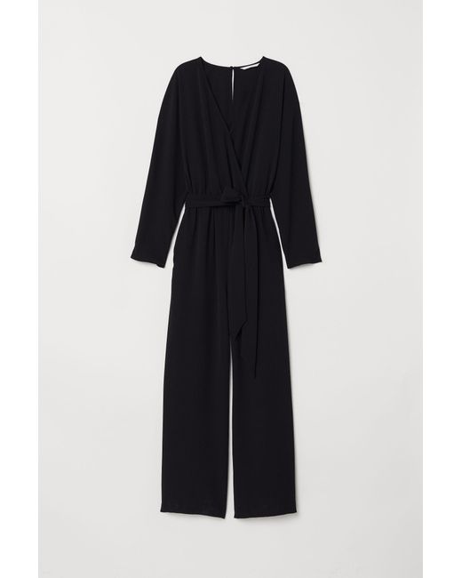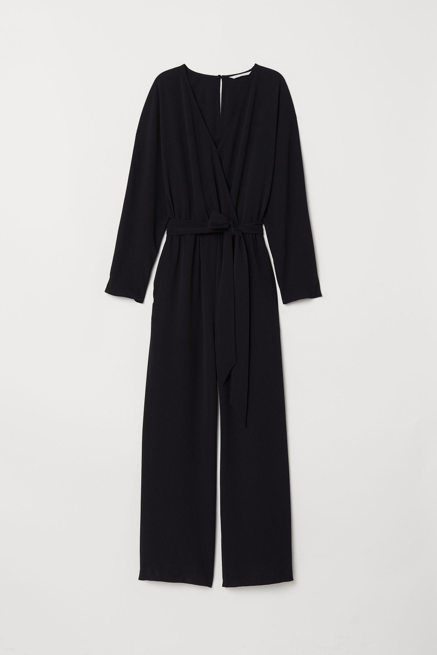 Long-sleeved jumpsuit in woven fabric with an opening and button at the back of the neck and a wrapover front with a hook-and-eye fastening. Elasticated seam and a detachable tie belt at the waist and straight, wide legs. Colour: black