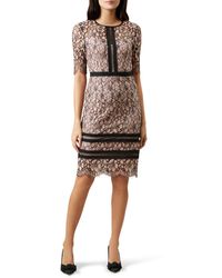 Think ahead of the special occasion season with this Penny dress by Hobbs. Strikingly fine and immaculately cut, the dress will make you stand out effortlessly. Presented in a tailored pencil silhouette, the Penny dress has elegant ballet-length sleeves with scalloped hems, and ladder trims on the front. A ribbon trim defines the waist, and a scalloped hem finishes the dress. The dress has an exposed zip fastening at the back is partly lined. Style with smart occasion accessories for a chic look. Personal styling advice. Dress Shape: Tailored. Drying Instructions: Please see care label. Length Read tooltip information Length Mini - A mini style falls mid-thigh to above the knee, Midi - A midi length is knee- to calf-length, Maxi - A maxi length is ankle- to floor-length: Knee Length. Length of Garment (Back Neck to Hem): 99cm. Lining Type: Lined. Main Fabric: Lace. Material: 59% Polyamide, 41% Cotton; Lining 88% Polyester, 12% Elastane. Model Details: 175cm/5'9'' and is wearing a size UK 8. Neckline: Round Neck. Pattern: Floral. Sleeve: Elbow length. Washing Instructions: Dry clean.