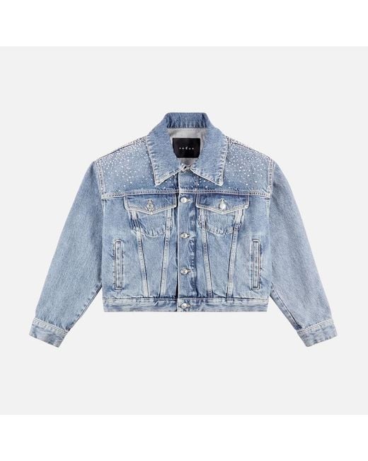 Comfort-fit Trucker jacket in stone washed denim, with shiny rhinestones on the yoke. Featuring branded stud buttons, it comes with two flap pockets. A versatile and feminine urban garment. Colour: blue