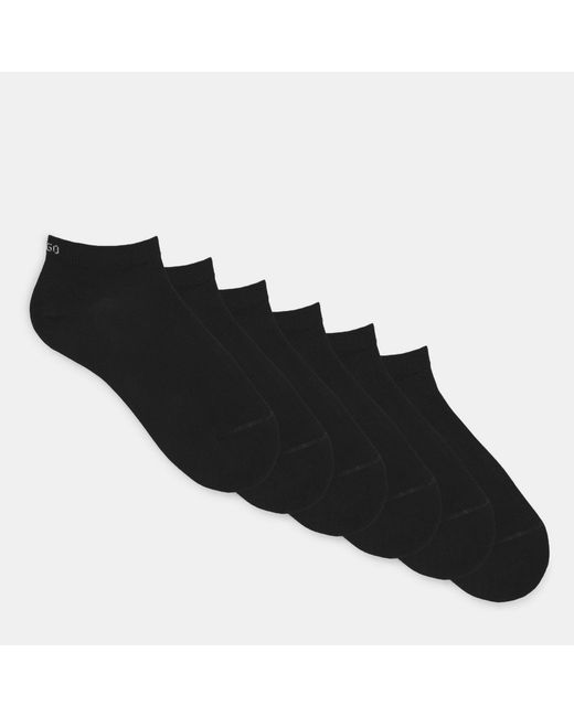 Upgrade your everyday essentials with these HUGO Cotton Mix 6-Pack Trainer Socks. The low-cut, ribbed design features a snug ankle cuff for comfortable wear. With reinforced toe and heel areas plus a subtle HUGO logo detail, these trainer socks offer practical comfort and a smart design for casual wear. Product Highlights: * Cotton-mix composition ensures breathability * Low-cut design sits discreetly below ankle * Reinforced heel and toe areas improve durability Colour: black