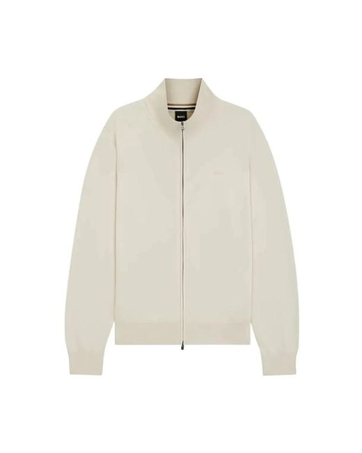 Hugo Upalano-L Cardigan is a knitted cotton cardigan designed for casual layering. It features a zip collar and a tonal embroidered logo for a clean, versatile look. Key attributes: Grey | Cotton | Zipper at collar | Long sleeves | Standard length | Tonal embroidered logo | Knit construction | Dimensions & fit: Regular fit | Composition & care: 100% cotton | Machine wash cold, gentle cycle. Do not bleach. Do not tumble dry. Iron at medium temperature. Professional dry clean (P). Colour: white