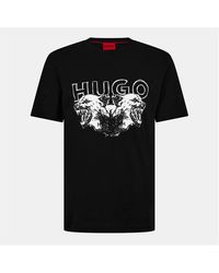 Go to MainlineHUGO Durro T Shirt In White. A cotton jersey t shirt with a ribbed crew neck and short sleeves. A statement animal graphic on the chest featuring the signature HUGO logo. 100% Cotton. Colour: white