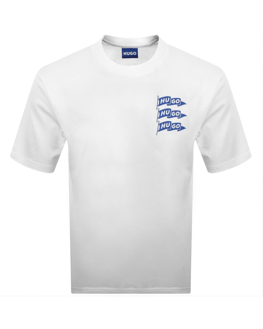 HUGO Blue Nalien Logo Patch T Shirt In White Regular Fit. A ribbed crew neck and short sleeves. The signature HUGO logo is featured on the left of the chest. 100% Cotton. Colour: white