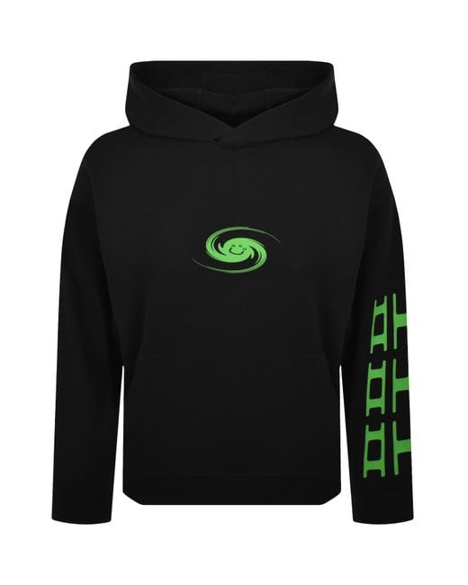 HUGO Blue Nufo Hoodie In Black. A large hood ribbed cuffs on the long sleeves and a ribbed waistband. A kangaroo style pocket at the waist. UFO themed graphics are printed on the chest and left sleeve. 100% Cotton. Colour: green
