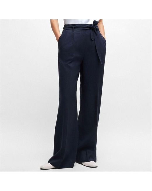 Womens BOSS Tepiala Wide-leg trousers in wool linen and stretch in blue. Extra-long wide-leg trousers with a tie belt by BOSS Womenswear. These comfortable trousers are crafted in a luxurious blend of virgin wool linen and stretch. Wide leg. Main material: 59% Virgin wool 39% Linen 2% Elastane pocketing: 100% Cotton. Dry clean. Ref: 50515073-404 Colour: blue