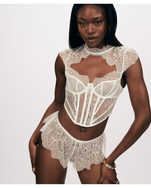 Channel your inner Goddess in this exquisite top! Crafted from delicate floral lace, it has boning in the front and back for a sculpted silhouette. The non-padded double-layered cups offer a semi-transparent allure, while the underwires ensure optimal support. For added convenience, the bra can be secured with five hook-and-eye closures. Finished with a lace-trimmed turtle-neck and short sleeves with button closure, it exudes elegance from every angle. It is part of our Noir collection. Complete the look by pairing it with our Camille French Lace Knicker for a truly captivating ensemble! Short sleeves Crop top Button closure Lace Noir collection. Colour: brown