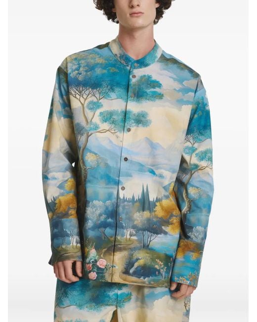 Blue landscape print button fastening long sleeves tunic collar Size: S. Gender: Male. Material:Cotton. Colour: blue