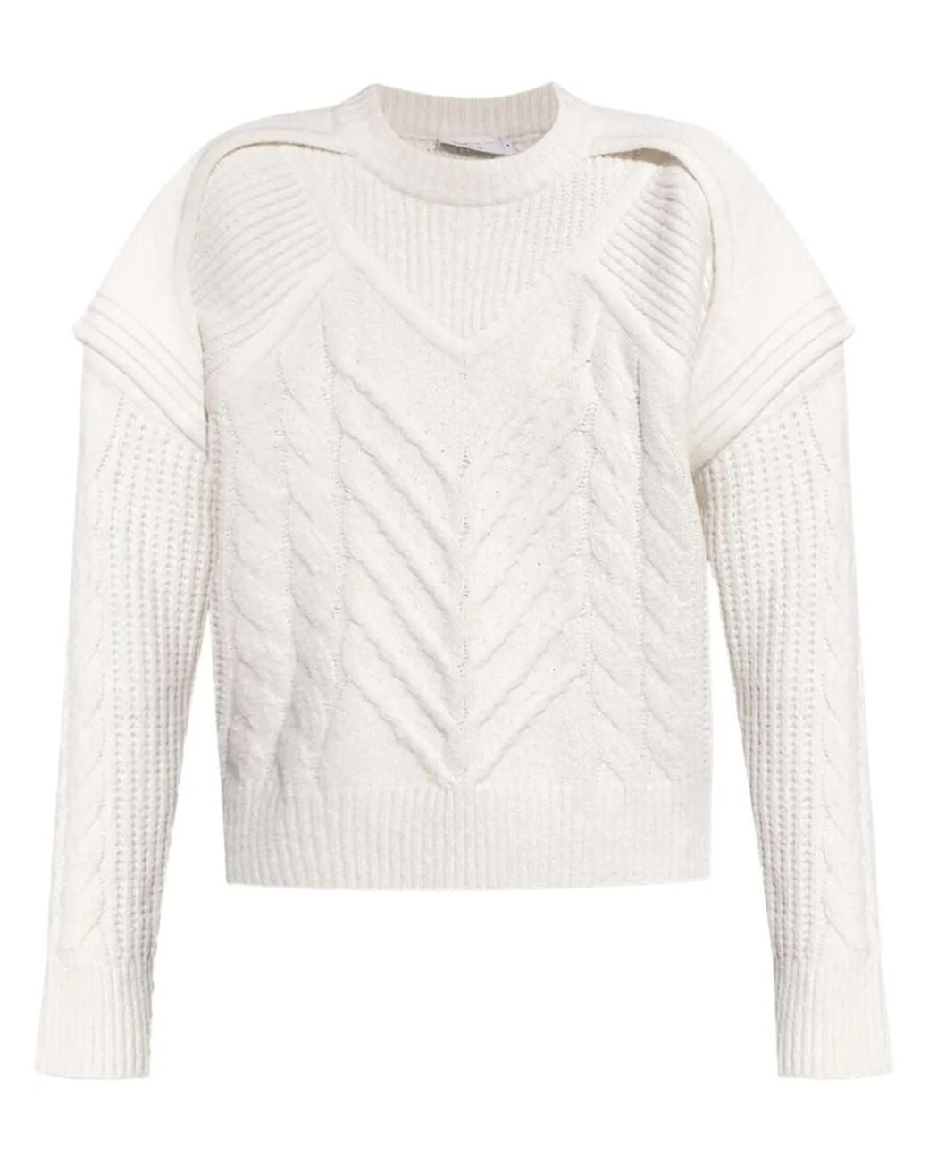 white cotton blend stretch-design chunky cable knit shoulder pads round neck long sleeves straight hem Size: XS. Gender: Female. Material:Polyester/Elastane/Cotton.