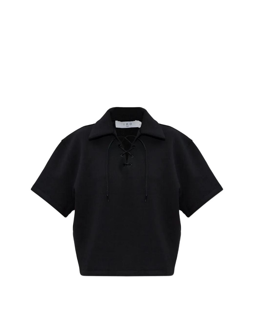 Black polo collar lace-up detail short sleeves Size: XS. Gender: Female. Material:Polyamide. Colour: black