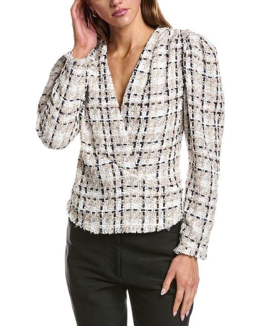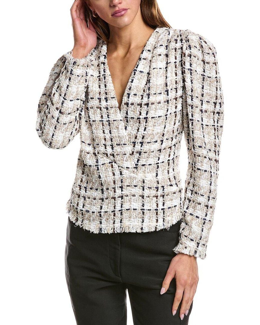 About the brand: Globally-inspired combinations. Patria Top in mixed ecru with metallic tweed fabrication, surplice front, pleated shoulders and fringe trim Please note: Size selections are European. For US conversions, please reference the size chart. Approximately 23in from shoulder to hem Left side seam zipper closure 38% polyester, 31% cotton, 15% acrylic, 8% polyamide, 5% viscose, 2% linen, 1% metallic polyester Dry clean only Imported Colour: white