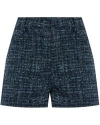 Introducing the BONNIA SHORTS from the exclusive collection by IRO, captivating with their unique style and elegance. Made from a navy-hued fabric, the shorts feature a subtle textured pattern reminiscent of exquisite tweed. The classic high-waisted