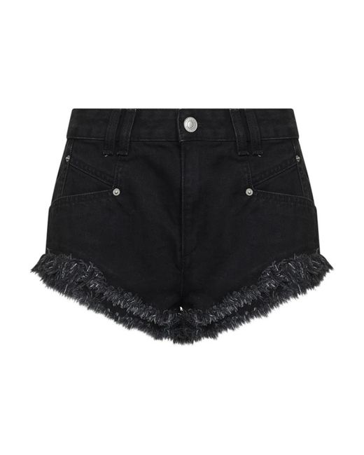 Isabel Marant Denim Shorts in a faded black wash, crafted from 100% cotton. They feature a zip-fly with a logoed metal button and frayed edges for a relaxed, worn-in look. Key attributes: Black | Faded black | Cotton | Zip-fly closure with logoed metal button | Waist with belt loops | Front pockets | Back patch pockets | Frayed edges | 'Isabel Marant'-embossed leather patch at back waistband | Composition & care: 100% Cotton | Machine wash cold, gentle cycle; line dry; iron on low heat. Colour: black