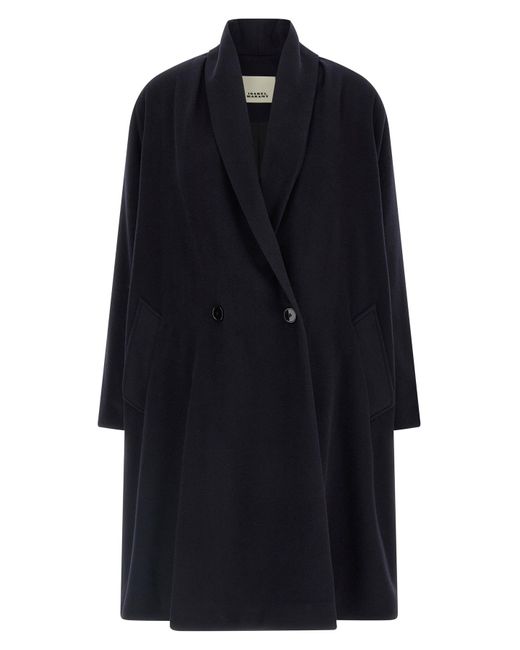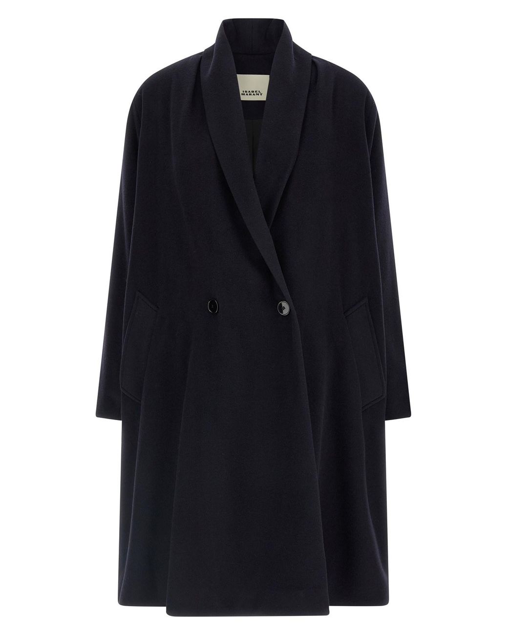 Elise' double-breasted wool blend long coat with front button closure, shawl collar, pockets, long sleeves with dropped shoulders, monogram twill lining. Composition: 75% vw 20% pa 5% ws. Size&Fit: comfort fit - FRENCH size.