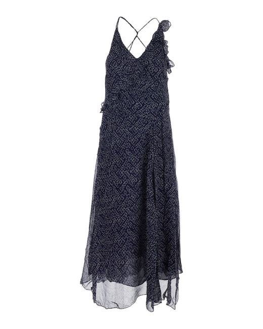 Women's Blue 'Luxie' Flared Dress With V Neck With Ruffles And All-Over Print