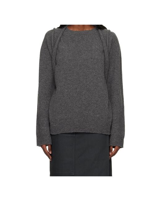 Ribbed knit crew neck, hem and cuffs, back panel detailing, long sleeves. Colour: grey